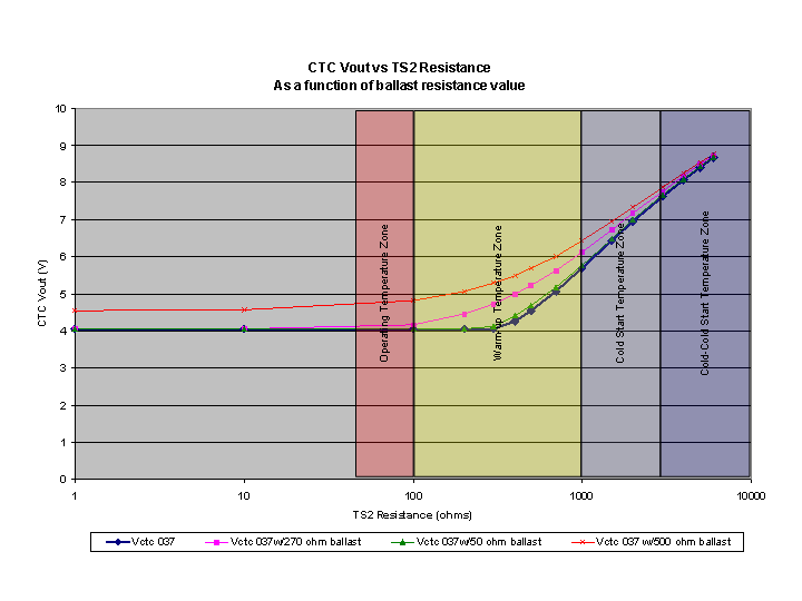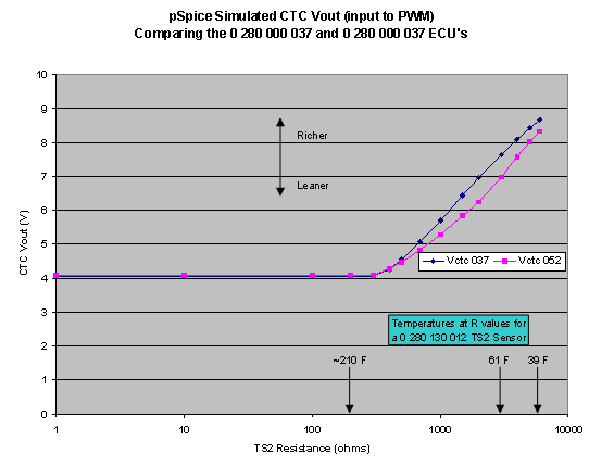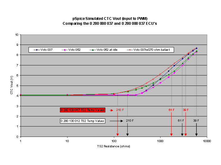 I recently simulated the CTC with pSpice, using measured component values from a 0 280 000 037 and a 0 280 000 052 ECU that I have disassembled. T451 was simulated using a standard 2N2222 npn transistor model. The 037 and 052 component values are significantly different for some resistors in the CTC, and the 037 lacks the 270 ohm R471 present in the 052. The output voltage was modeled as a function of TS2 resistance, over a range for a 0 280 130 012 sensor that corresponds to a temperature span from 39 F to well above operating temperature. Results are shown below: