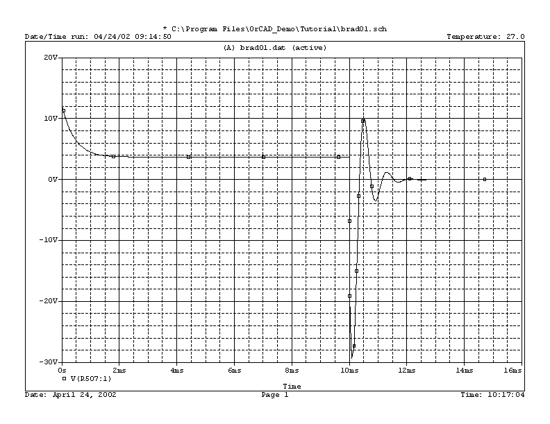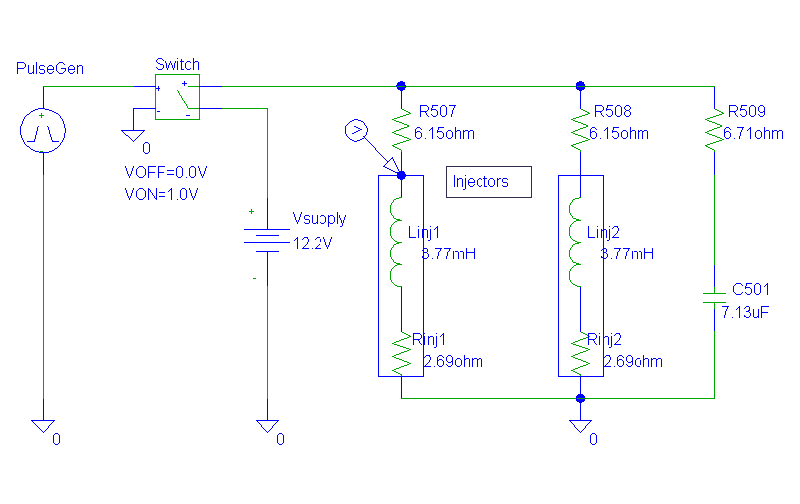 Below are the results of the simulation, measuring the voltage at the node indicated on the schematic. This node is the equivalent of measuring the voltage waveform at the injector.