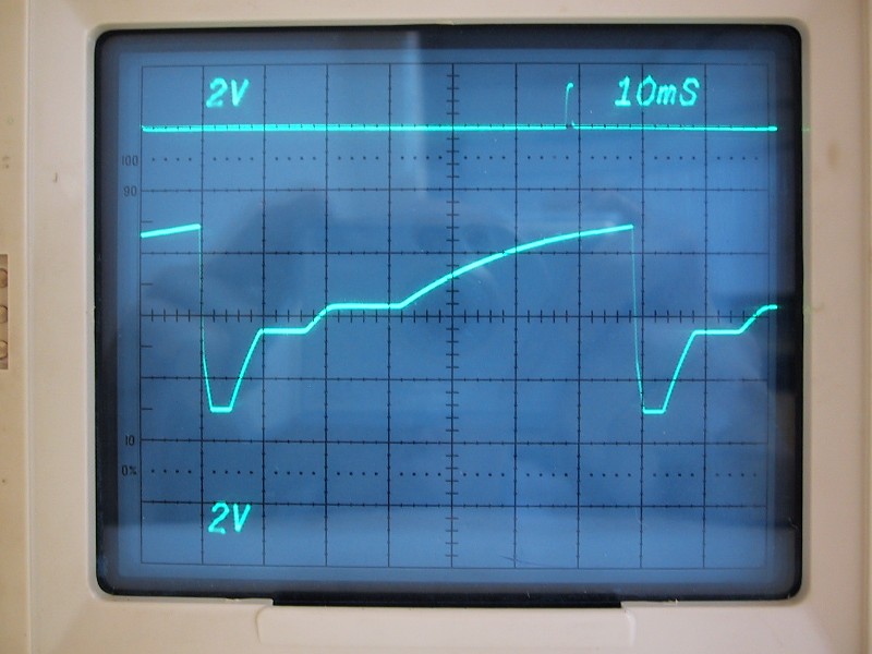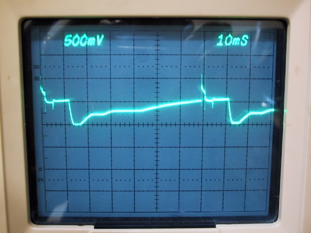 Below is a measurement taken at pin 10 of the edge connector on a 0 280 000 044 ECU, showing the level-shifted, combined output of the SC and IM circuits. Note that this characteristic can be fairly easily measured with an oscilloscope on any D-Jetronic system by probing pin 10 of the MPS. Ground at the bottom of the screen. Note the effect of the triggering of the loop circuit is visible at about 70 mS. The control voltage ranges between 2.0 and 2.5 V. It is also apparent that this ECU uses 5 Wfm's, as the waveform is similar to the 015 and 037 ECU's.