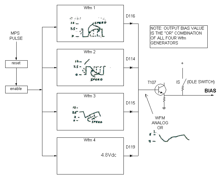 From the sheet 3 of the schematic, note that the Wfm 1, 2, and 3 generators each have selected components (resistors) , picked to match the specific Ve curve of the engine application the ECU was designed for. The Wfm4 generator is a simple voltage divider that generates the 4.8V output. The output of the Wfm's are buffered by T107 (emitter-follower). The buffered output signal is combined with the output of the IM and sent to the PL, where it sets the threshold for the turn-off of T201. Note that for non-idle conditions, the output of the SC controls the T201 threshold, whereas at idle conditions, the output of the IM dominates.