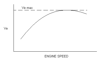Volumetric efficiency (Ve) is the ratio of the actual volume of air taken in by a cylinder divided by the cylinder volume. The maximum Ve is mostly determined by the design of the intake system (2 vs. 4 valve, valve sizes, intake runner design, throttle body design, air filter, etc.), and the engine speed at which the maximum Ve occurs is mostly determined by valve timing and by intake runner design. Typical max Ve for an engine with a overhead 2-valve configuration is about 75 to 80%. A generalized Ve curve for an engine is shown below: