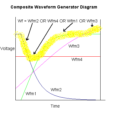 The output of each of the Wfm generators are "OR'ed" together, which results in an output signal that is the maximum voltage of all of the waveforms at a given time. Why four Wfm generators? The reasons will become in a moment. The sketch below is a composite of all of the Wfm generators "OR'ed" together, to show how each contributes to the complete waveform: