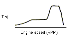 To understand the effect on the injection pulse duration at a specific engine speed, first note that lower values of bias voltages affect the PL circuit to extend the injection period (see the PL section for a description of this behavior), increasing Tinj. On sheet 3, the opposite behavior is noted, so this observation is in disagreement with Kerfoot's notes which appear to be in error. Next, since the bottom axis is time, engine speed is proportional to the reciprocal of time. Therefore, you need to invert and flip the characteristic as shown below: