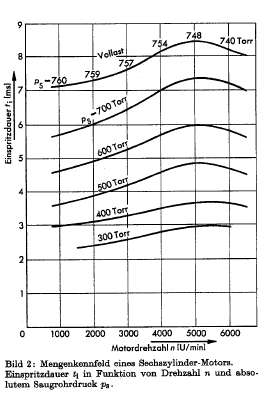 "Vollast" = full load, corresponding to the "0 in. Hg" curve in Randy's and my graphs. Manifold pressures here are measured in Torr, an absolute scale as opposed to a gauge scale like inches of Hg. Assuming 760 Torr = 0 in. Hg, the manifold pressures levels map as follows: